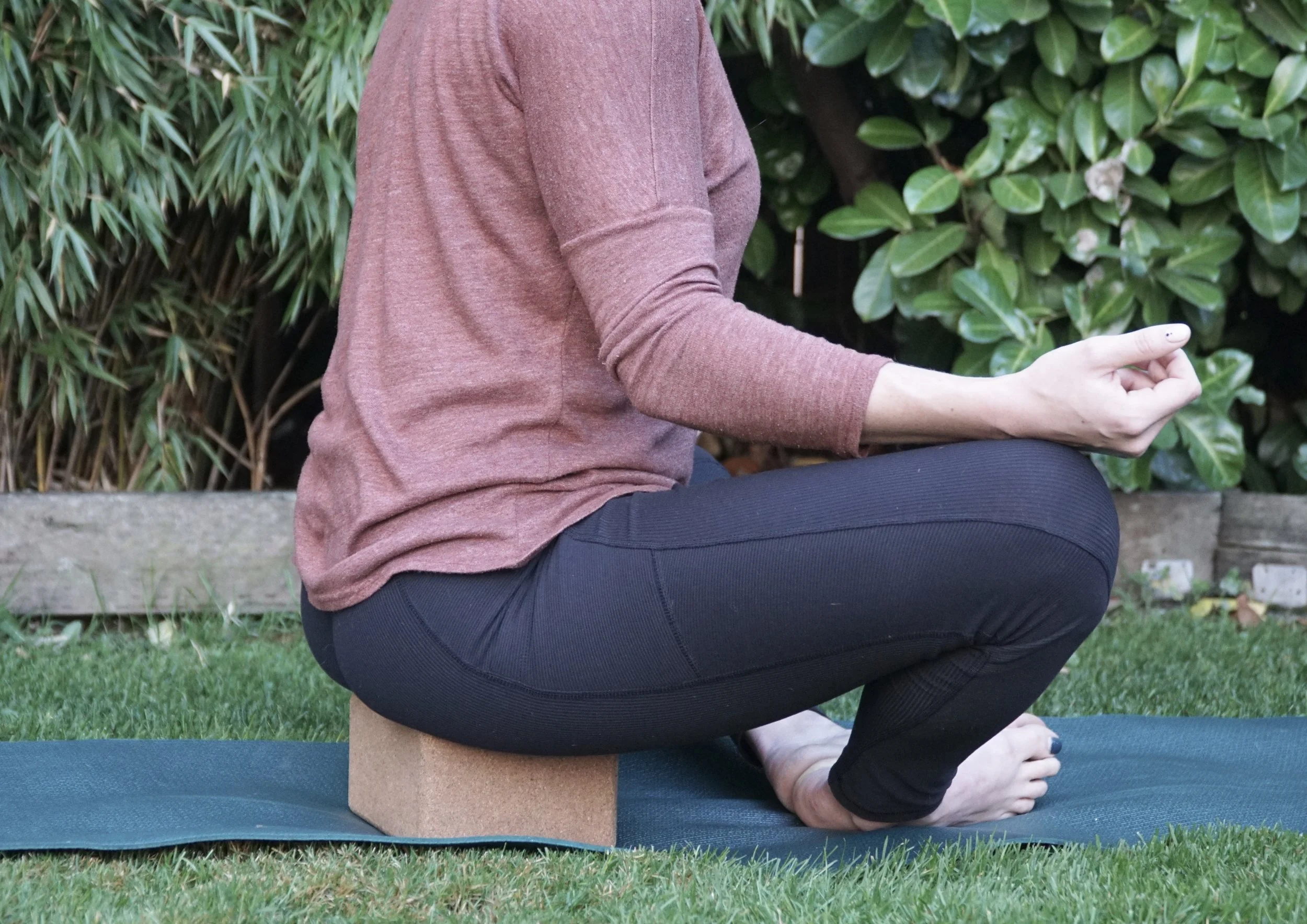 2. Bound Angle Pose (Baddha Konasana)- Setting the block under your sit bones. Lifting the hips up can help make it easier to achieve a straight spine in your seated position. Use the block length wise underneath you so that both sit bones can rest on it, from here, tilt the pelvis down so that you are sitting up tall. This will help your seated poses, as well as assist in a seated forward fold.