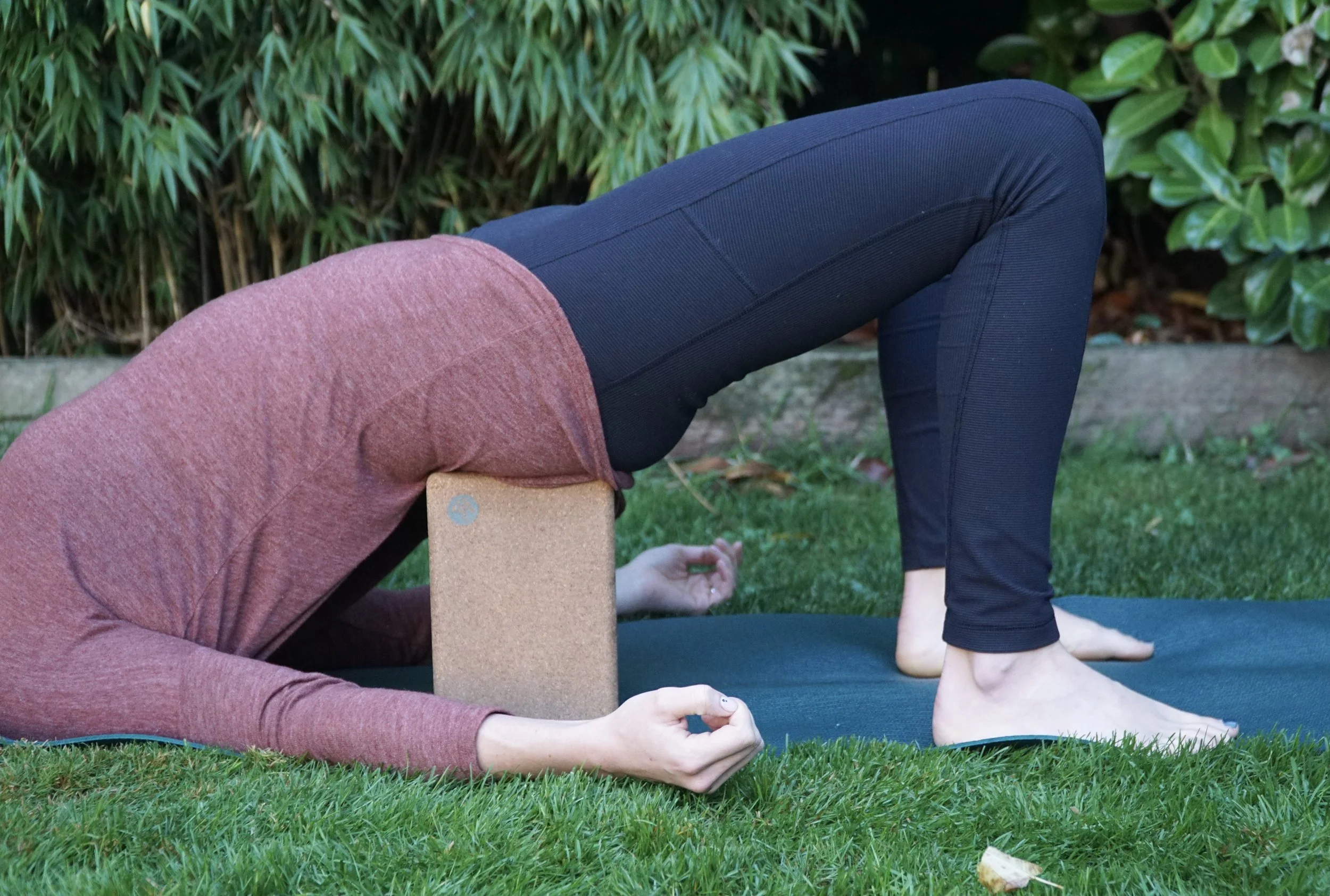 5. Supported Bridge (Setu Bandha Sarvangasana) - Using the blocks under your sacrum: This can be such a lovely pose to finish out your practice with. This assist can happen with one or two blocks, we suggest trying both to find what feels best for you. Starting in bridge pose prep, on your back with your heels drawn in towards your hips, knees facing the ceiling, squeeze your glutes, lift your low back off the mat, and slide one or both blocks underneath your sacrum. You may need to adjust to a higher or lower setting. Play around with different levels on your block, before choosing on your variation. The blocks should be flat on the mat, secure under your sacrum, and the pelvis should remain neutral for optimal relaxation. Once here, sink in and enjoy!
